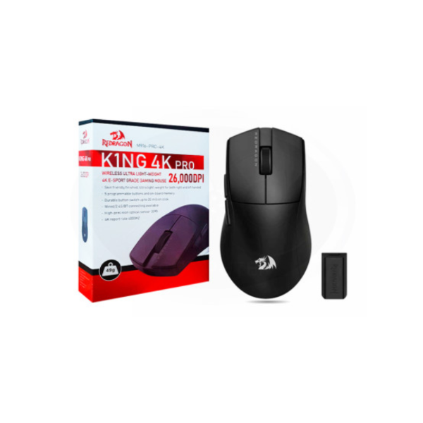 El mouse Redragon K1NG PRO (M916P-PRO-4K) es un periférico ultraligero y de alto rendimiento, diseñado para jugadores de deportes electrónicos que buscan precisión y velocidad. Destaca por su triple conectividad y una alta tasa de sondeo (polling rate) de 4000 Hz en modo inalámbrico de 2,4 GHz.
