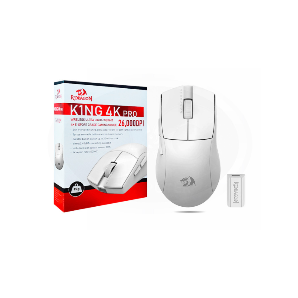 El mouse Redragon K1NG PRO (M916P-PRO-4K) es un periférico ultraligero y de alto rendimiento, diseñado para jugadores de deportes electrónicos que buscan precisión y velocidad. Destaca por su triple conectividad y una alta tasa de sondeo (polling rate) de 4000 Hz en modo inalámbrico de 2,4 GHz.